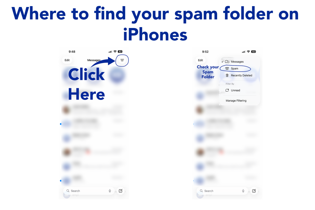 If you do not get your message, please search for this number. It may have gone to your spam folder. Below are instructions on how to find your spam in the three major text applications.